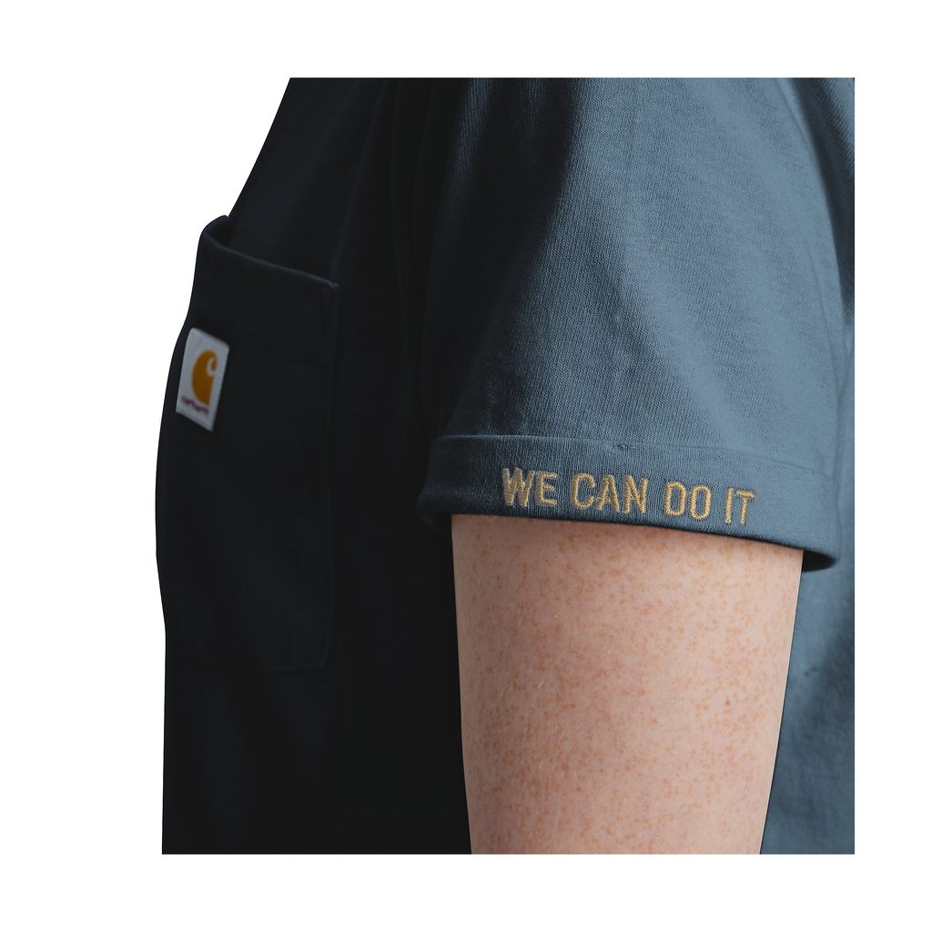 Výšivka na levém rukávu s manžetou a měkký plastisolový potisk Carhartt „Women“ na zádech